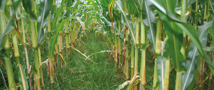 Während der Sommermonate entwickelt sich Proterra Mais unter den Maispflanzen. Die starken Pflanzen vertragen die Beschattung und die Sommertrockenheit gut. Während der Abreif des Mais verringert sich die Beschattung durch den Mais und das Wachstum der Untersaat nimmt zu.